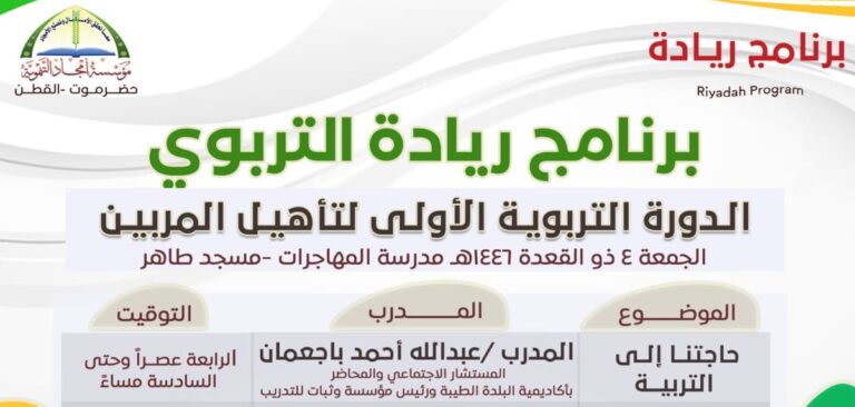 أقام القسم العلمي الدعوي لمؤسسة أمجاد التنموية – القطن بالتنسيق مع إدارة وثبات في مدرسة المهاجرات برنامج يادة التربوي يوم الجمعة الموافق 4 ذو القعدة